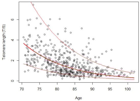 Telomere length versus age in the group of 162 subjects. The red lines indicate the random-effects model estimated on a logarithmic scale and the range of variation due to the addition of the individual random effects.