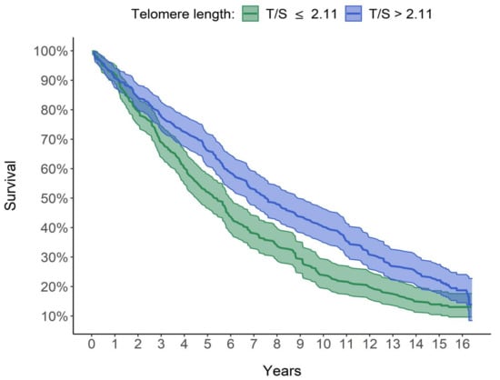 Figure 3 shows that the group with longer LTL (T/S > 2.11; curve in blue) had a consistently higher survival than the group with shorter LTL (T/S ≤ 2.11; curve in green). The median survival time, (corresponding to the survival time of 50% of subjects in each group), was 7.57 years for subjects with telomeres longer than 2.11 (T/S) and only 5.41 years for subjects with telomeres equal or shorter than 2.11 (T/S). The two adjacent 95% confidence interval limits did not overlap for most of the curve. The difference between the two survival curves was significant using both the log-rank test (p < 0.001) and the Peto–Peto log-rank test (p < 0.001), which was better because a slight intersection between the two survival curves was observed in the first period (see Figure 3).