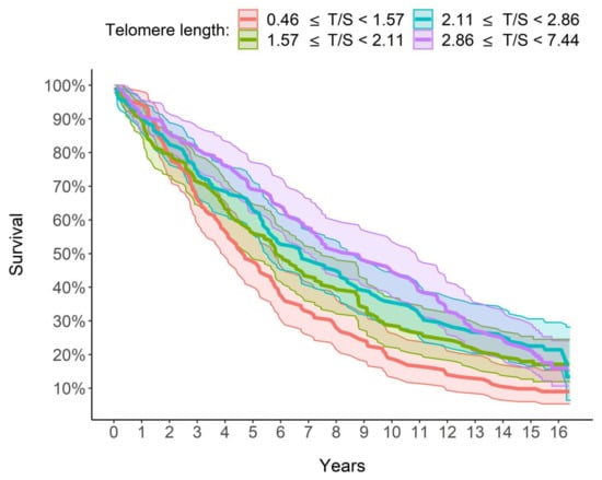 A key finding from our study is the steadily increasing relationship between LTL and survival: the longer the LTL, the greater the survival and, therefore, a lower mortality risk is estimated. In particular, as shown in Figure 3, the group with the longest quartile LTL (T/S >2.86) had 8.79 median years of survival, which is over 4 years higher than that of the group with the shortest quartile LTL (<1.57 T/S). Furthermore, in a multivariate analysis taking into account the effect of other factors, LTL increased survival and therefore decreased mortality. In detail, for each unit increase in the LTL, the risk of mortality decreased by 22.41%, with the other explanatory variables being equal, age included (Table 5).