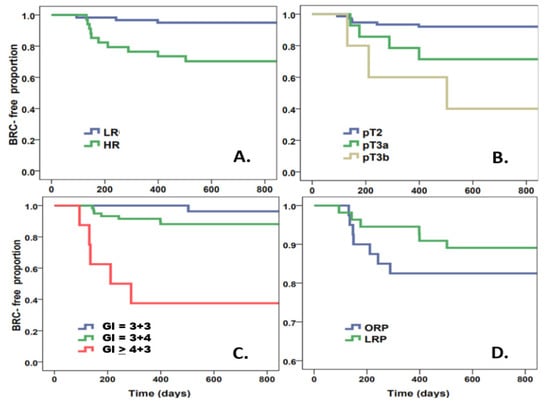 During the median follow-up time of 32 months, BCR occurred in 12 out of 83 patients (14.5%) (patients with postoperative early ADT or RT were excluded). There was a significant difference in proportion of BCR-free survival between patients with HR or LR (Figure 1A, log rank p < 0.001); with pT2 vs. pT3 (Figure 1B, log rank p < 0.001) and Gleason score (Figure 1C, log rank test p < 0.001). There was no significant difference between the BCR-free survival rates of patients undergoing ORP or LRP (Figure 1D, log rank p = 0.33).