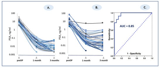 Individualized PSA response to radical tumor excision. (A) Low-risk group, (B) high-risk group, (C) ROC curve for predicting BCR. Abbreviations: PreOp: values before RP; one month and three months: PSA values at one-month and three-month time point postoperatively.