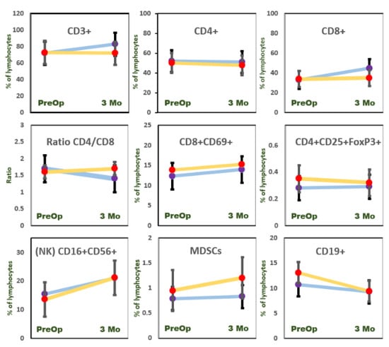 Overall, different postoperative immunocyte profiles of LRP (CD8+ ↑, NK ↑, MDSC≈) vs. ORP (CD8+ ≈, NK ↑, MDSC ↑) were observed. The ORP-induced MDSCs in some patients might lead to a chain of events in the postoperative period. The importance of MDSC increase in postoperative period has been reported in lung cancer patients []. This study demonstrated that MDSCs increased after lung cancer surgery, and surgery-induced MDSCs correlated significantly with elevated numbers of Treg in circulation. Experimental surgery-induced lung tumors were related to MDSC increase in this study. We did not observe any significant increase in Treg, regardless of the risk group or surgical method applied. The postoperative increase in circulating MDSCs observed in our ORP group and in HR patients might also lead to some adverse effects, such as angiogenesis activation. For instance, the MDSCs isolated after surgery from lung cancer patients were more efficient in promoting angiogenesis and tumor growth than MDSCs isolated before surgical operation []. A potentially less invasive approach not upregulating suppressor MDSC release in the postoperative period might be advantageous over ORP.