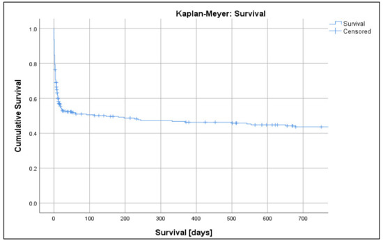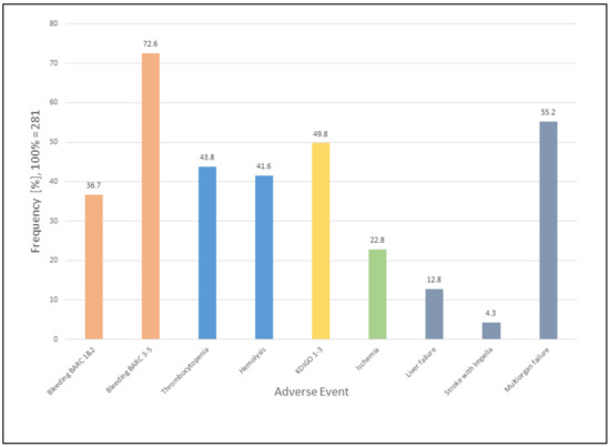 Over the nine-year studied period (2011–2019), a total of 281 patients received LV mechanical support with the Impella® (Table 1). The most common indication for Impella® insertion was ischemic CS (70%). One patient received an Impella® twice within a few days. The median SAPS II score was 53 (IQR, 37–68) in survivors and 70 (IQR, 54–83) in non-survivors. The SAPS II score was higher in patients who died during their hospitalisation than in those who died after hospital discharge (73 (IQR, 60–85) and 54 (IQR, 42.3–72.3), respectively). Median duration of Impella® support was 72 h (IQR, 35–121). The maximum duration in one patient was 493 h (20.5 days). A total of 262 patients (93%), experienced an adverse event. With the exclusion of patients without available data on stroke and mortality, 250 out of 269 (93%) experienced an adverse event. Bleeding was the most frequent adverse event, as shown in Table 2 and Figure 1. After excluding bleeding complications, a total of 261 out of 281 patients (93%) suffered an adverse event. After excluding patients without available data on stroke and mortality, 249 out of 256 (96%) suffered an adverse event. Complications and outcome parameters are described in Table 2. Details on adverse events stratified by sex (Table S1) and age categories (Table S2) are shown in the Supplementary Materials. Almost half (48%) of all patients died during hospitalisation and overall mortality was very high with a total of 165 (59%) deceased patients. Of the patients, 43 (15%) died within the first 24 h after Impella® placement, while a total of 95 (34%) patients died within one week. Thirty-day mortality was 46%, while 50.5% of patients had died after one year, as shown in Table 2 and Figure 2.