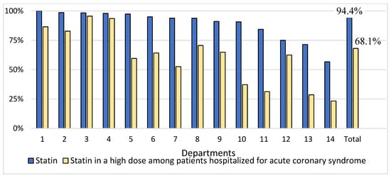 Proportions of patients prescribed a statin at discharge among all patients and statin in a high dose among those hospitalized for an acute coronary syndrome by departments.