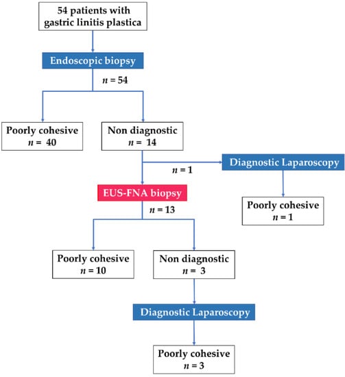 - Chiyo, T.; Kobara, H.; Mori, H.; Katsuki, N.; Haba, R.; Masaki, T. Submucosal Endoscopic Sampling for Indefinite Gastric Linitis Plastica Infiltrating into the Submucosal Layer. J. Gastrointestin. Liver Dis. 2015, 24, 375–378. [Google Scholar] [CrossRef]