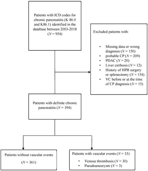 We excluded patients <18 years at the time of data analysis, patients with cancers in the abdominal cavity, patients with cirrhosis of the liver, patients without a Swedish personal identity number, patients with probable CP according to M-ANNHEIM criteria, patients diagnosed with vascular complications before or at the time of CP diagnosis, and patients who have previously undergone pancreatic surgery or splenectomy. We initially identified 954 patients with CP, and after application of the above-mentioned exclusion criteria, 394 patients were included in the final analysis (Figure 1).