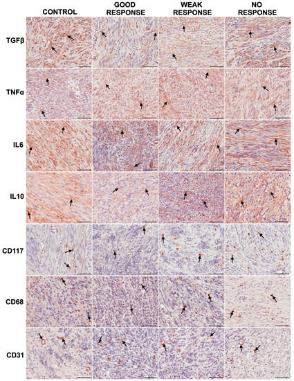 Representative light micrographs of immunoexpression (brown-stained cell cytoplasm indicated by black arrows) of inflammatory markers and vessel marker in fibroid cells in the control group and study groups after 3 months of treatment with ulipristal acetate (UPA): good, weak, and no response to treatment. Note: scale bar—100 µm. Abbreviations: CD31—marker of endothelial cells; CD68—marker of cells of the macrophage lineage; CD117—marker of mast cells; IL6—interleukin 6; IL10—interleukin 10; TGFβ 1—transforming growth factor β 1; and TNFα—tumor necrosis factor α.