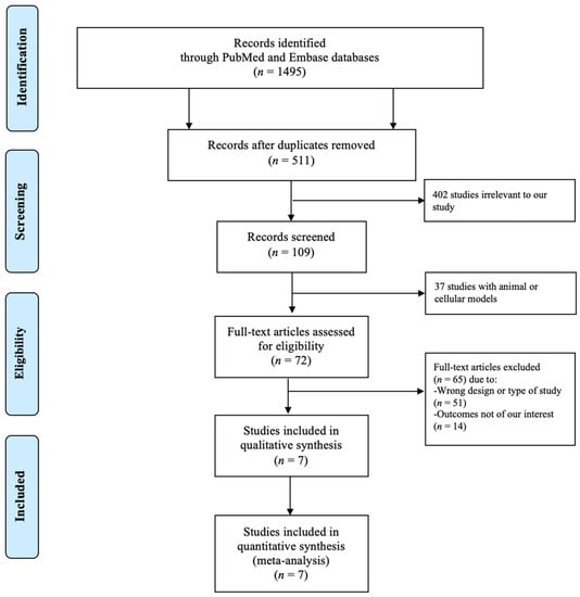 Figure 1 shows a PRISMA (Preferred Reporting Items for Systematic Reviews and Meta-Analyses) flow diagram that depicts the process of identification, screening, eligibility, and inclusion or exclusion of the studies. The initial search of the PubMed and EMBASE databases yielded 1495 articles. A total of 511 duplicate studies were removed, followed by elimination of 402 studies that were irrelevant to our study and 37 studies with animal or cellular models. Subsequently, 72 studies underwent title and abstract review. Of these articles, 51 studies were excluded because they were not of the appropriate type or design of study for our analysis, and 14 studies were eliminated as they did not have the outcomes of interest. The final analysis included seven unique studies with a total of 3042 subjects.