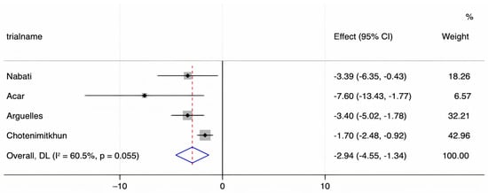 We aimed to investigate potential publication bias via the funnel plot and Egger’s test [,]. However, as we only had up to seven studies in the analysis, this number was insufficient to reject the assumption of no funnel plot asymmetry; thus, we did not perform a funnel plot or Egger’s test.