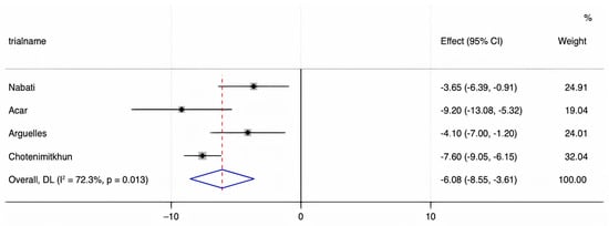 We assessed the presence of heterogeneity among the studies in terms of the Q-statistic and the corresponding p-value. In the present case of p < 0.1, heterogeneity among studies existed. We also quantified the heterogeneity degree by using the I2 statistic which showed substantial heterogeneity among studies (I2 > 60%). Thus, in our study, we employed the random-effects model to analyze the pooled effect size. The mean final post-chemotherapy LVEF in the control group (without concurrent statin use during chemotherapy) was significantly lower than that in the statin group (with concurrent statin use during chemotherapy) (WMD = −2.94%, 95% CI: −4.55–−1.34, p < 0.001). Additionally, patients in the control group had a more statistically significant mean LVEF change (i.e., mean LVEF difference between pre- and post-chemotherapy) compared to patients in the statin group (WMD = −6.08%, 95% CI: −8.55–−3.61, p < 0.001). Finally, it was found that the intervention group receiving statin had a significantly lower incidence of chemotherapy-induced cardiomyopathy compared to the control group (OR = 0.41, 95% CI = 0.28–0.60, p < 0.001). The forest plots demonstrating the WMD of the final LVEF post-chemotherapy, the WMD of the change in LVEF between pre- and post-chemotherapy, and the OR for the incidence of chemotherapy-induced cardiomyopathy are shown in Figure 2, Figure 3 and Figure 4, respectively.