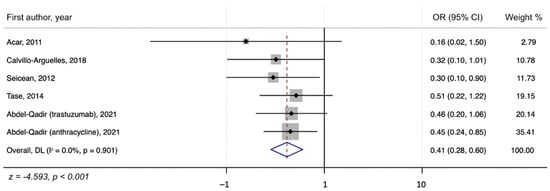 A total of seven studies with 3042 subjects (1382 subjects received the concurrent statin) were included in our meta-analysis [,,,,,,]. The main characteristics of the included studies are described in Table 1. Regarding the study design, five studies were observational and two were RCTs. The mean pre- and post-chemotherapy LVEF information was provided in the studies by Nabati et al. [], Acar et al. [], Calvillo-Argüelles et al. [], and Chotenimitkhun et al. []. In regards to the incidence of cardiomyopathy, the study by Calvillo-Argüelles et al. [] and Abdel-Qadir et al. [] provided the value of OR and its corresponding 95% CI. In the studies by Acar et al. [], Seicean et al. [], and Tase et al. [], the raw data for the number of subjects with CIC in the control and the statin groups are provided, and calculations were manually performed to obtain the OR and its corresponding 95% CI. NOS of the five selected studies ranged from 6 to 9 with a mean score of 8, reflecting a high quality of these studies. For the two RCTs included in the meta-analysis, the Cochrane Collaboration tool for assessing the risk of bias was used. This showed a low risk of bias in most categories, except for the lack of blinding in the study by Acar et al. [].