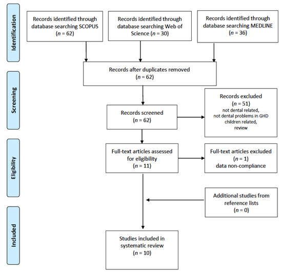 This systematic review of the available literature on the condition of the teeth of pediatric GHD patients in terms of dental caries, tooth wear, enamel defects, and dental maturity and tooth eruption, craniofacial growth and morphology, and malocclusion was carried out in accordance with Cochrane Collaboration guidelines [33].