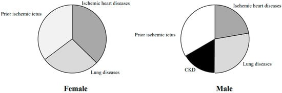 The clinical characteristics of our population, by gender differences, are described in Table 1. In female DM-HT COVID-19 patients, compared to males, we observed a higher frequency of ischemic heart diseases, which aligns with another study [] (47.5% versus 14.8%, respectively, p: 0.001). Additionally, we report a higher prevalence of lung diseases in DM-HT COVID-19 patients, compared to males (34.8% versus 18.5%, respectively, p: 0.001) and prior ischemic ictus (44.9% versus 22.2%, respectively, p: 0.001). Conversely, in male DM-HT COVID-19 patients, compared to females, we observed a higher proportion of renal diseases (0.1% versus 11.1%, respectively, p: 0.001) (Figure 1).