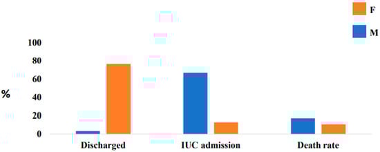 Outcomes by gender differences in DM-HT groups, were reported in Table 3 and are described here. In particular, in females, we report that 18.3% were of critical, 21.5% were severe, and 62% were mild. However, in our study, we described that 76.5% of females, compared to 3.4% of males, were discharged (p < 0.0001); 66.9% of males, compared to 12.8% of females, were admitted into the intensive care unit (p < 0.0001), as reported in Figure 3. However, males have a higher death rate (17.3% vs. 10.7%, p < 0.0001). In male subjects, we observed a higher proportion on the O2 therapy (51.8% vs. 29.1%, p < 0.0001, respectively), and high-flow oxygen therapy with nasal cannula (100.0% vs. (93.7%, p < 0.0001, respectively) compared to female subjects. In relation to pharmacological therapy, we report a higher proportion on hydroxychloroquine in male subjects (96.3% vs. 44.9%, p < 0.0001) compared to female subjects. However, we observed a higher proportion of the Darunavir/ritonavir (7.4% vs. 0.0%, p < 0.0001, respectively) and on LMWH therapy (70.4% vs. 30.5%, p < 0.0001) in male subjects compared to female subjects.