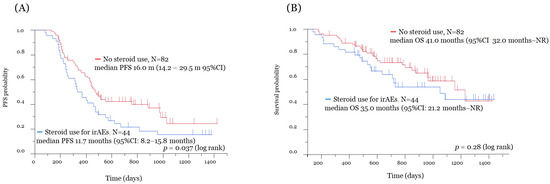 Kaplan–Meier survival analysis according to systemic steroid use for any reason. The figures show Kaplan–Meier curves for PFS (A) and OS (B) in the systemic steroid use for any reason cohort (blue line) and the no steroid use cohort (red line). Survival analysis with ICI treatment: significant difference in PFS and no significant difference in OS. irAE, immune-related adverse event; PFS, progression-free survival; OS, overall survival; NR, not reached.