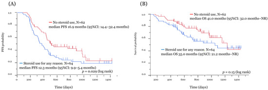 In all patients, the median PFS and OS were 14.8 months (95% confidence interval (CI): 12.3–16.4 months) and 38.4 months (95% CI: 32.0 months–not reached), respectively (Supplementary Figure S1A,B). Of the 126 patients, 87 experienced recurrence, and 48 died due to PD. The median follow-up period was 23.6 months (range: 4.7–47.7 months). The Kaplan–Meier survival curve according to the use of systemic steroids for the improvement of irAEs is shown in Figure 2. The median PFS in patients with and without the use of systemic steroids was 11.7 months (95% CI: 8.2–15.8 months) and 16.0 months (95% CI: 14.2–29.5 months), respectively, with significant difference (p = 0.037) (Figure 2A). No significant difference in the median OS was recognized between the two groups (35.0 vs. 41.0 months) (p = 0.28) (Figure 2B). In addition, we analyzed patients with systemic steroid use for reasons other than irAEs, such as palliative care and chronic obstructive pulmonary disease. Of 126 patients, 62 had no use of systemic steroids, and 64 received systemic steroids for any reason. Figure 3 shows the Kaplan–Meier survival curve for the use of systemic steroids regardless of irAEs. Patients administered systemic steroids had significantly shorter PFS than those who did not (p = 0.029) (Figure 3A). However, no significant difference in OS was observed between the two groups (p = 0.15) (Figure 3B). Exploratory univariate and multivariate analyses were conducted to identify important outcome variables (Table 2). Of the factors listed, univariate analyses demonstrated that only using systemic steroid to treat irAEs was significantly associated with longer PFS. After adjusting for multiple clinical variables, multivariate analyses revealed that using only systemic steroids alone to treat irAEs was significantly associated with improved PFS. Then, only ages above and below 70 years was significantly associated with improved OS.
