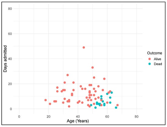 DS patients admitted for COVID-19 were slightly older than those admitted for non-COVID-19 pneumonias (T21RS cohort vs. CMBD cohort: 46.4 years (SD 11.8) vs. 42.2 years (SD 13.9), t = 3.224, p < 0.01), although this difference was not clinically significant. No differences were detected in sex distribution between COVID-19 and non-COVID-19 pneumonias. In-hospital mean length of stay of DS patients with COVID-19 was similar to that of non-COVID-19 patients (10.3 days (SD 7.9) vs. 9.9 (SD 9.4), t = 0.264, p = 0.79). However, there was a noticeable difference in length of stay by discharge status. DS patients with COVID-19 who were discharged alive stayed significantly longer than those who died during their admission (12.1 days (SD 8.2) vs. 5.1 days (SD 3.4), t = 5.39; p < 0.001), whereas the opposite was detected in patients with DS admitted for non-COVID-19 pneumonias, suggesting a more severe course of disease in COVID-19 patients. Even so, the mean length of stay of COVID-19 DS patients who died while hospitalized was significantly shorter than that of non-COVID-19 cases (t = −5.95, p < 0.001). The distribution of patients according to age, length of admission, and outcome in both groups is depicted in Figure 1 (T21RS cohort) and Supplementary Figure S4 (CMBD cohort).