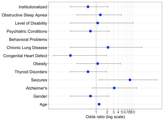 Obstructive sleep apnea (OR 1.5, 95%—IC 0.4–6.1), global psychiatric condition (OR 0.7—CI 0.2–2.3), behavioral problems (OR CI 1.2, 95%—IC 0.3–4.5), seizures (OR 8.3—CI 1.2–45), Alzheimer’s disease (OR 3.4—CI 0.8–12.7), and age (OR 1.2—CI 1.1–1.3) presented a positive association with mortality, although only age and seizures reached statistical significance. Nevertheless, when seizures were adjusted for the presence of Alzheimer’s disease, their association with mortality was no longer statistically significant.