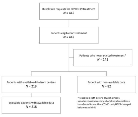 The CUP for COVID-19 patients with severe/very severe lung disease was approved by the Italian National Health Authorities and the Ethics Committee at Spallanzani Hospital in Rome, Italy [37]. Eligible patients had to be hospitalized with serious or life-threatening COVID-19. The potential patient benefit justified the use of ruxolitinib, and the potential risk was not unreasonable in the context of the disease. Written informed consent was obtained prior to the start of treatment. Three single center experiences of the Italian CUP of ruxolitinib have been already reported elsewhere [32,33,35], and those groups of patients were also included in this retrospective data collection.