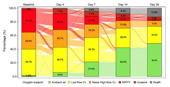 Oxygen support was described in terms of proportions at each time point according to the Last Observation Carried Forward (LOCF) approach. A Sankey diagram was used to represent the distribution of oxygen support at each time point and to show the flow of patients in terms of oxygen support between two consecutive visits.