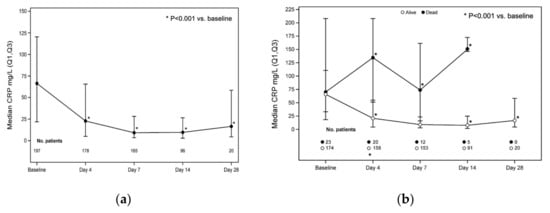 CRP levels at each time point and according to mortality are shown in Figure 3. Significant decreases were seen in the CRP levels by day 4 (p < 0.0001 vs. baseline), which remained low throughout the study period (p < 0.0014 at days 7, 24, and 28) (Figure 3a). Patients who were alive at last follow-up showed rapid and sustained decreases in CRP. In contrast, those who died showed a rapid increase in CRP at day 4 (OR 1.02, 95% CI 1.01–1.03, p < 0.0001; Figure 3b).