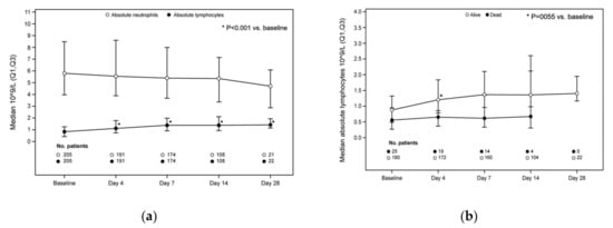 The lymphocyte and neutrophil levels over time are shown in Figure 4a. The median increase from baseline in the absolute lymphocyte counts was 0.28 × 109/L, 0.50 × 109/L, 0.63 × 109/L, and 0.78 × 109/L at days 4 (p < 0.0001 vs. baseline), 7 (p < 0.0001 vs. baseline), 14 (p < 0.0001 vs. baseline), and 28 (p = 0.0005 vs. baseline), respectively. An increase in the median absolute lymphocyte counts was seen in the survivors at day 4, but not in patients who died (OR 0.24, 95% CI 0.09–0.66, p = 0.0055; Figure 4b).