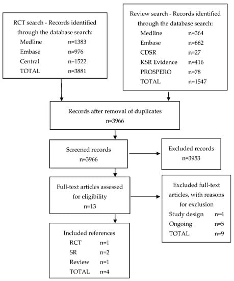 To avoid missing any relevant SRs and RCTs, a focused literature search was conducted using a combination of free text and database thesaurus terms. No restrictions on language or publication status were applied. Reference lists of the included articles were also searched for additional studies.