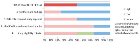 The risk of bias (methodological quality) of RCTs was assessed using the Cochrane Risk of Bias Tool for randomized clinical trials, while reviews were assessed using ROBIS [,].