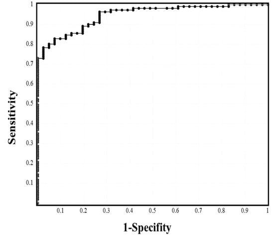 The ROC analysis of laboratory biomarkers in the mild and moderate I stages vs. moderate II and severe stages (Table 3, Figure S1), CRP (Figure 1), albumin, and A/G ratio showed ≥80.0% sensitivity; CRP, ferritin, albumin, A/G ratio, and hemoglobin A1c showed an odds ratio of ≥10.00; and CRP, PCT, ferritin, albumin, A/G ratio, and LDH showed an area under the curve (ARC) ≥0.800. In our multivariate analysis, CRP (p = 0.006) and AST (p = 0.033) were identified as significant factors in mild to moderate II stage vs. severe stage; albumin (p = 0.022), CRP (p = 0.001), and LDH (p = 0.011) were identified as significant factors in mild to moderate I stage vs. moderate II to severe stage; and LDH (p = 0.032) and CRP (p = 0.036) were identified as significant factors in mild stage vs. moderate I to severe disease stages.
