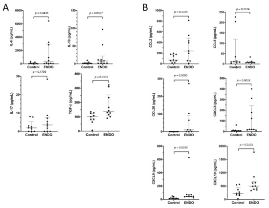 - Sikora, J.; Smycz-Kubanska, M.; Mielczarek-Palacz, A.; Bednarek, I.; Kondera-Anasz, Z. The involvement of multifunctional TGF-beta and related cytokines in pathogenesis of endometriosis. Immunol. Lett. 2018, 201, 31–37. [Google Scholar] [CrossRef] [PubMed]