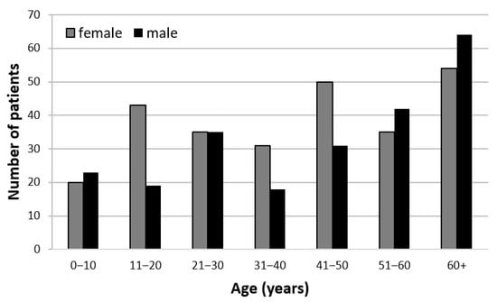 Out of a total of 500 examined patients, 268 were female (53.6%). The mean age was 41.9 years (ranging from 1 to 95 years). Figure 1 presents the age and sex distribution of the study sample.