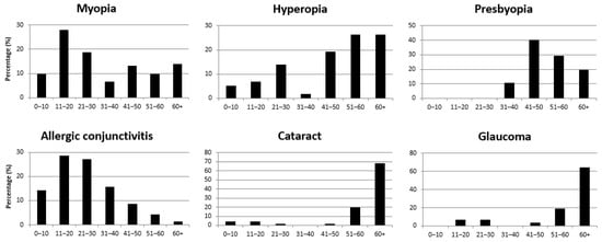 Out of the six most frequent ocular diagnoses, the distribution within the different age groups of presented patients was calculated (Figure 2). Myopia was most common in the age groups of 11–20 years, (27.9%), 21–30 years (18.9%) and 60+ years (13.9%), but myopic patients were found within all age groups. Myopic persons with more than −1.50 dioptres were included. Hyperopia increased with age, with the highest rates for the ages 41–50 (19.3%), 51–60 (26.3%) and 60+ (26.3%). Presbyopia was mainly diagnosed in patients aged 41–50 (40.2%), with decreasing percentages for the age groups of 51–60 (29.4%) and 60+ (19.6%). Allergic conjunctivitis was highest in the age groups of 11–20 (28.6%) and 21–30 (27.1%) years and decreased further in older patients. Cataract was mainly diagnosed in the age group of 51–60 (19.7%) and 60+ (68.2%), whereas glaucoma was mostly diagnosed over the age of 60+ (64.5%).
