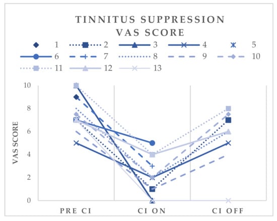 The VAS score was used to evaluate the effect of electrical stimulation on tinnitus loudness. Complete suppression (VAS ≤ 1) was observed in four patients (31%), and (almost) complete suppression (VAS ≤ 2) was observed in seven patients (54%). The preoperative VAS scores were compared with the postoperative VAS scores in the ON or OFF condition of the CI. The average preoperative VAS score in 13 patients who received a CI was 7.7 (range 5 to 10), the postoperative score with the speech processor switched ON was 2.5 (range 0–6) and the postoperative score with the speech processor switched OFF was 5.1 (range 0–8). Figure 1 shows the evolution of the VAS scores in each of 13 implanted patients. Tinnitus loudness reduction while using the speech processor ranged from 29% to 100% with a mean tinnitus loudness reduction of 68%. All but one patient with positive or relatively favorable advice had significant and clinically relevant tinnitus loudness reduction while using the speech processor.