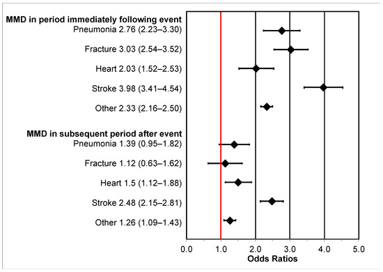 Long-term MMD, i.e., lasting from 6 to 12 months after the event, was associated with heart attacks (OR = 1.5 (1.12–1.88)), stroke (OR = 2.45 (2.15–2.81)), and other hospitalizations (OR = 1.26 (1.09–1.43)). Associations of long-term MMD with pneumonia (OR = 1.39 (0.95–1.82)) and fracture (OR = 1.12 (0.63–1.62)) hospitalizations were not statistically significant.