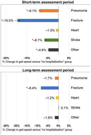 Long-term changes in gait speed were only significantly associated with prior fracture hospitalizations (−8.4% (−9.7% to −7.3%)). All other hospitalization types were not associated with long-term gait speed changes (Figure 2).