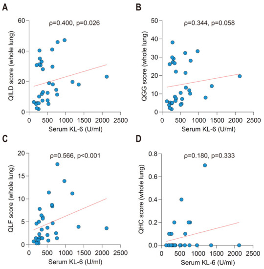 3.3. Validity 2: Serum Biomarker for Interstitial Lung Damage Was Positively Correlated with QILD Score and Its Components
