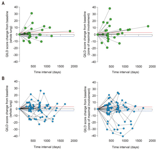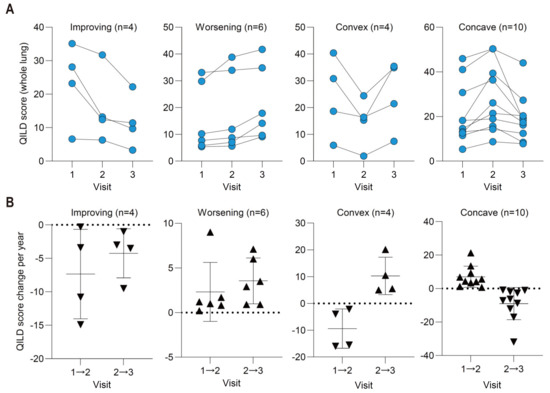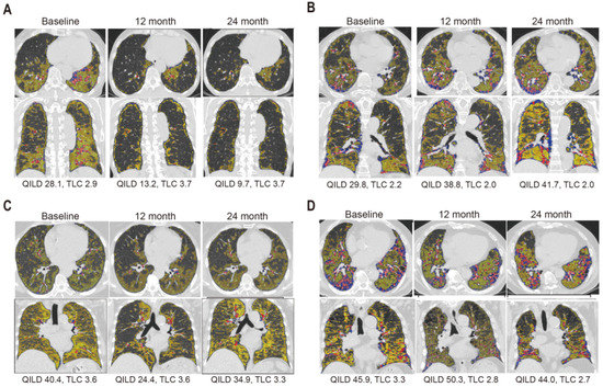 3.6. Four Distinct Pattern Changes over 24 Months Were Quantitatively Visualized by QILD Scores