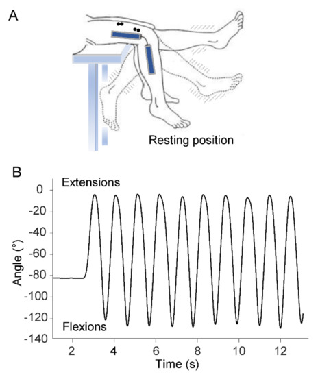 Participants sat on a medical couch with their knees flexed at resting position and their legs dangling and not touching the ground (Figure 1A). After receiving verbal instructions and demonstration of the procedure, participants were asked to perform a series of ten voluntary flexion–extension movements of the lower limb at maximal range of motion in the sagittal plane (Figure 1B). Angular displacements of the swing movements were measured by means of an electrogoniometer (Biometrics Ltd., Gwent, UK) placed on the lateral surface of the knee joint. Kinematic data were filtered using a low-pass, zero-lag, second-order Butterworth filter with 5 Hz cutoff frequency.