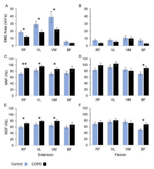 Summary of statistical results of electromyographic parameters. Comparison of sEMG amplitude (A,B), MNF (C,D) and MDF (E,F) between COPD patients (black) and healthy individuals (azure) for each muscle. In the left panel are the values measured during extension movements, while in right panel are the values measured during flexion movements. Abbreviations: MNF = mean frequency; MDF = median frequency; RF = Rectus Femoris; VL = Vastus Lateralis; VM = Vastus Medialis; BF = Biceps Femoris. The data are expressed as means and standard errors; * p < 0.05; ** p < 0.01.