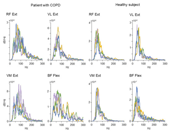 Representative examples of Power Spectrum Density of sEMG recorded in a patient with COPD (the four panels on the left) and in a healthy subject (the four panels on the right). Each panel contains four spectral profiles obtained from the second (blue line), the fourth (purple line), the sixth (green line) and the eighth (yellow line) leg extension (Ext) or flexion (Flex) movements. Power spectra regarding the RF, VL and VM were obtained during the extension movements, while the spectrum regarding the BF was obtained during flexion movements. For other abbreviations see Figure 2.