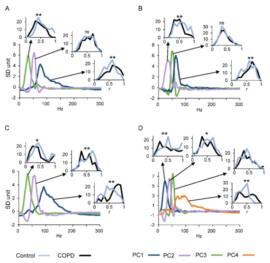 An opposite behavior was observed for the third PC (green line, 25% of the total variance), which had the profile shifted towards the low frequencies, and the control group showed a better correlation with respect the COPD patients (control r mean value ± SD: 0.52 ± 0.2; COPD r mean value ± SD: 0.38 ± 0.18; p < 0.001).