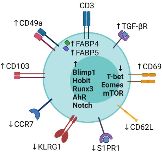 A. Surface markers, intracellular molecules, and transcription factors of TRM. The expression levels of these molecules on TRM are shown by upward arrows (increased expressions) and downward arrows (decreased expressions). Created with BioRender.com (accessed on 21 August 2021).