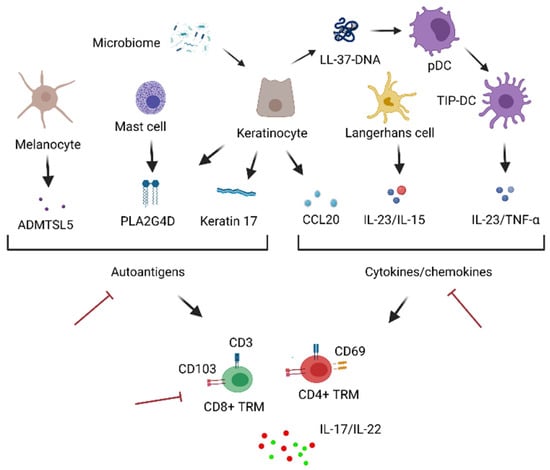 Development of TRM in psoriasis. TRM are activated by either autoantigens or cytokines/chemokines. Autoantigens include ADMTSL5 on the surface of melanocytes, PLAG4D from mast cells and keratinocytes, and keratin 17 from keratinocytes. Antimicrobial peptide LL-37, also from keratinocytes, binds to self-DNA to activate pDC and TIP-DC, leading to the production of IL-23/TNF-α. IL-23/15 from Langerhans cells and CCL20 from keratinocytes also activate TRM. These stimulated TRM produce proinflammatory cytokines, such as IL-17A and IL-22, the hallmarks of psoriasis. The development of pathogenic TRM can be inhibited by stopping pathways related to TRM activation or directly inhibiting the activity of TRM (red inhibition icon). Created with BioRender.com (assessed on 21 August 2021).