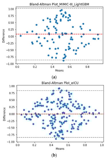 Bland–Altman plot for the truth vs. the predicted values of MV duration using LightGBM (the best validated model) in Scenario II (the best early scenario). (a) Development database; (b) validation database. The X- and Y-axes stand for the mean and the difference of the two measurements, respectively. Please note that the values shown in the Bland–Altman plot are normalized in the interval (0, 1) (i.e., values are scaled to have corresponding values between 0 and 1).