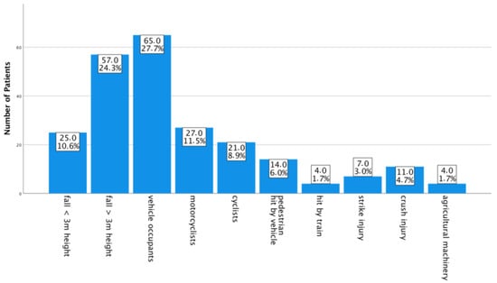 Reason for chest trauma is known for all 235 patients. According to the registry of the German Trauma Society, mechanisms were specified into 10 categories: approximately one third of our patients had a fall, of which n = 25 (10.6%) fell < 3 m and n = 57 (24.3%) > 3 m height. Traffic accidents accounted for more than half of our patients; vehicle occupants n = 65 (27.7%), motorcyclists n = 27 (11.5%), cyclists n = 21 (8.9%), pedestrians hit by a vehicle n = 14 (6.0%) and category “others” n = 4 (1.7%) that were all hit by a train were counted. The category miscellaneous is divided into strike injury n = 7 (3.0%), and “others” n = 15 (6.4%), which comprise mainly accidents with agricultural machinery n = 4 (1.7%) and n = 11 (4.7%) cases of crush injuries (Figure 2).