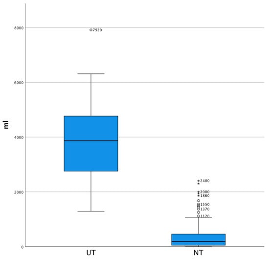 Boxplot diagrams comparing chest-tube output of UT and NT (p < 0.001). o indicates datapoints within 1.5–3 IQR, * above 3 IQR.