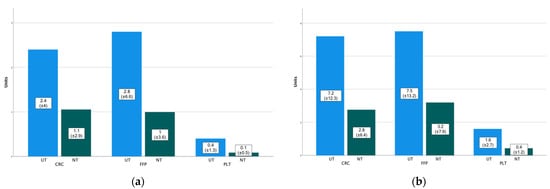 The median initial haemoglobin value of UT was Mdn 11.7 (IQR 9.2–14.3) g/dL as opposed to Mdn 12.3 (IQR 10–13.9) g/dL of patients that needed no or delayed thoracotomy (p = 0.786). Within the first three hours of hospital treatment, UT needed averagely 2.4 (±4) units of concentrated red cells (CRC), 2.8 (±6.6) units of fresh frozen plasma (FFP), 0.4 (±1.3) units of platelet concentrates (PLT) as opposed to 1.1 (±2.9) CRCs, 1 (±3.6) FFPs and 0.1 (±0.5) PLTs of NT (Figure 5a, CRC: p = 0.222; FFP: p = 0.292; PLT: p = 0.331). Within a 24 h interval, 7.2 (±12.3) CRCs, 7.5 (±13.2) FFPs, 1.6 (±2.7) PLTs were needed in UT versus 2.8 (±6.4) CRCs, 3.2 (±7.9) FFPs, 0.4 (±1.2) PLTs in NT (CRC: p = 0.293; FFP: p = 0.149; PLT: p = 0.120) (Figure 5b).