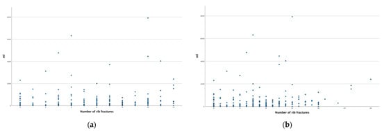 Scatter plot showing the relationship between the highest number of rib fractures on one side (a) and both sides (b) on one side with chest-tube output in mL.