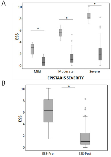 (A) Box-whiskers plots corresponding to the HHT-ESS in mild, moderate, and severe HHT patients before and after the sclerotherapy treatment. * p < 0.001. (B) Considering all the severity groups together, differences between before and after treatment were also highly significant * p < 0.001.