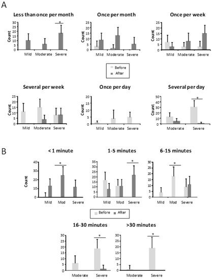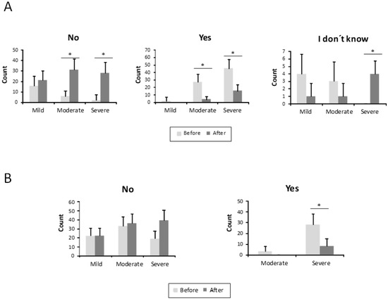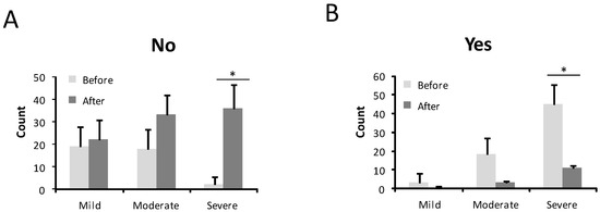 Number of patients who needed medical care before and after the treatment in mild, moderate, and severe HHT-ESS patients. (A). No need medical care. (B). Need medical care. * p < 0.05.